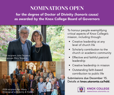 October 23, 2024 Tags: News News at Knox HDD Nominations Open Nominations are open for the degree of Doctor of Divinity (honoris causa) to honour persons exemplifying critical aspects of Knox College’s mission. This year, nominations are due December 15, 2024. Find Nomination Forms and Terms of Reference at knox.utoronto.ca/hdd.
