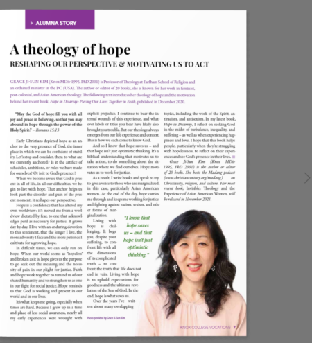 Grace Ji-Sun Kim (Knox MDiv 1995, PhD 2001) is Professor of Theology at Earlham School of Religion and an ordained minister in the PC (USA). The author or editor of 20 books, she is known for her work in feminist, post-colonial, and Asian American theology. The following text introduces her theology of hope and the motivation behind her recent book, Hope in Disarray: Piecing Our Lives Together in Faith, published in December 2020.
