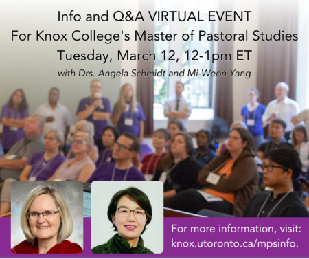 Looking to know more about our Master of Pastoral Studies (MPS) program? Working on your MPS application? Join Dr. Schmidt, Rev. Dr. Yang, and current MPS students for an MPS Info and Q&A Session online on Tuesday, March 12, noon to 1pm ET. Contact knox.admissions@utoronto.ca to register today!