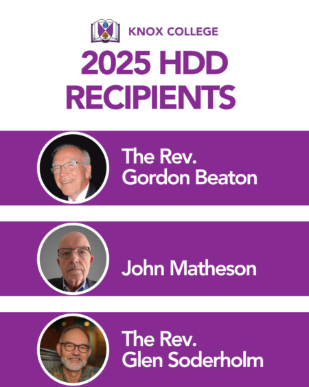 Principal Ernest van Eck and the Knox College Board of Governors are pleased to announce The Rev. Gordon Beaton, John Matheson and The Rev. Glen Soderholm as recipients of the degree Doctor of Divinity (honoris causa) for 2025. Knox College will confer the degree at this year’s Convocation service, on May 14, 2pm in the Knox College Chapel.