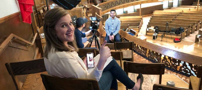 The Rev. Maren McLean Persaud, associate minister, and the Rev. Christian Persaud, interim pastoral care minister, preparing a 3 in 1 Worship video at Grace Presbyterian Church in Calgary.